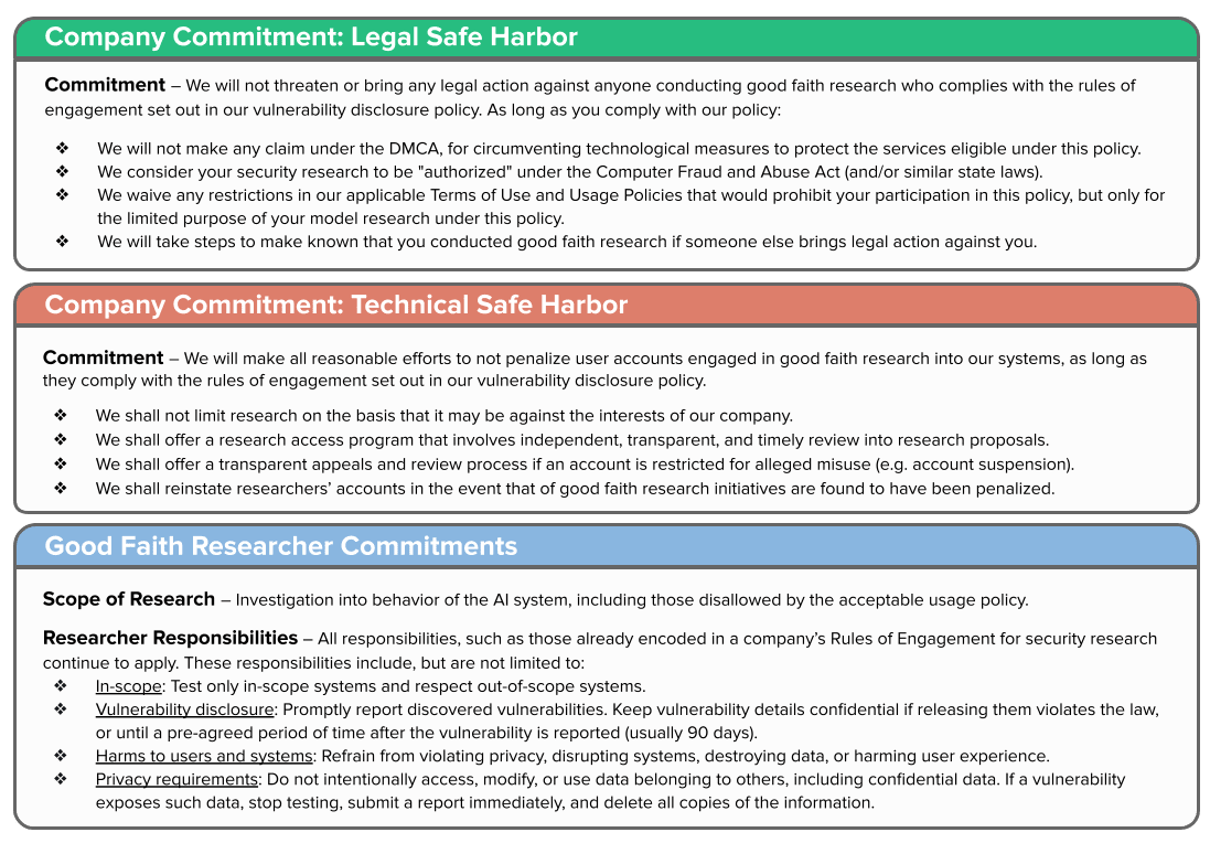 We believe that a pair of voluntary commitments could significantly improve participation, access, and incentives for public interest research into AI safety. The two commitments are a legal safe harbor, which protects good-faith, public-interest evaluation research provided it is conducted in accordance with well-established security vulnerability disclosure practices, and a technical safe harbor, which protects this evaluation research from account termination. Both safe harbors should be scoped to include research activities that uncover any system flaws, including all undesirable generations currently prohibited by a company’s terms of service.