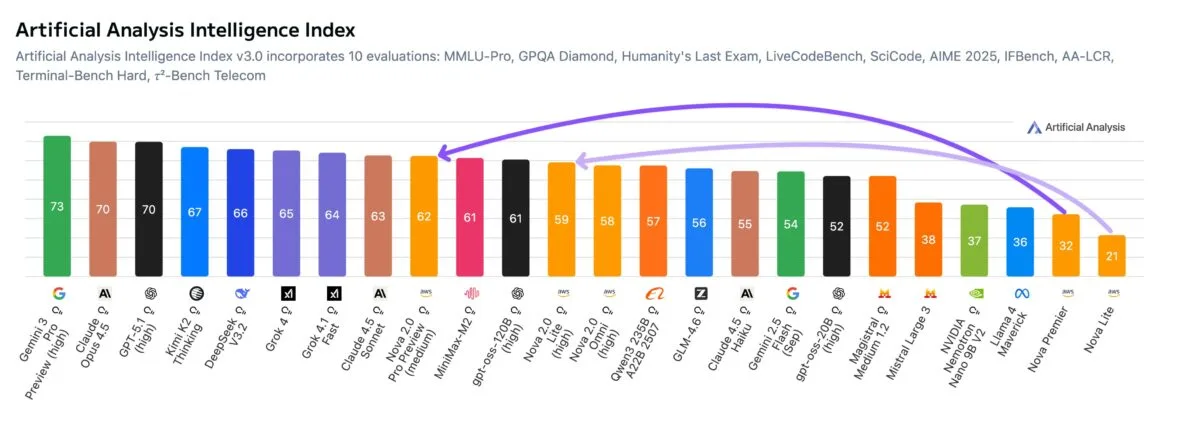 Eine Testreihe von Artificial Analysis bescheinigt dem Flaggschiff Nova 2.0 Pro (Preview) einen deutlichen Leistungssprung. Im hauseigenen Index legte das Modell um 30 Punkte zu und schließt damit zur Spitzengruppe auf - bleibt aber weiter hinter den Spitzenmodellen der Konkurrenz.