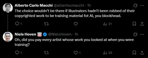 Der Streit um KI-Bildgeneratoren, ausgedrückt in einem Screenshot. Laut jüngster Rechtsprechung aus UK ist KI-Datentraining keine Copyright-Verletzung. | via XHoven verteidigt sich: Ohne KI hätte das Hardcover rund 200 Dollar kosten müssen. Dank generativer KI könne das Buch als kostenloses PDF erscheinen und für 30 Dollar als Hardcover verkauft werden. Laut Hoven gehe der gesamte Betrag an Amazon für Druck und Versand, er selbst verdiene daran nichts. Das Buch sei ohne KI nicht möglich gewesen und solle Kindern beim Lesenlernen helfen. Zur Wahrheit gehört auch, dass es Werbung für sein Unternehmen ist, das eine entsprechende Lern-App vertreibt.