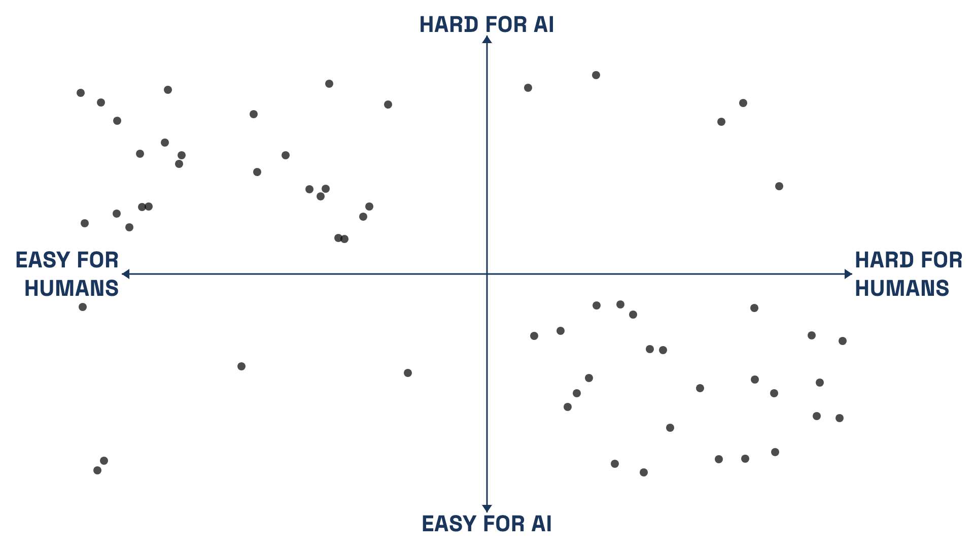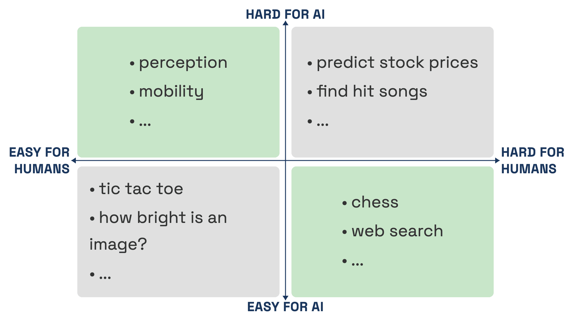 The other two quadrants of the chart are different. On the top left, tasks like playing soccer, that are easy for humans but currently hard for AI, are extremely interesting to AI researchers. That’s because we know it’s possible to teach AI these skills, but we haven’t yet managed to do so, which makes them great tests for AI progress.