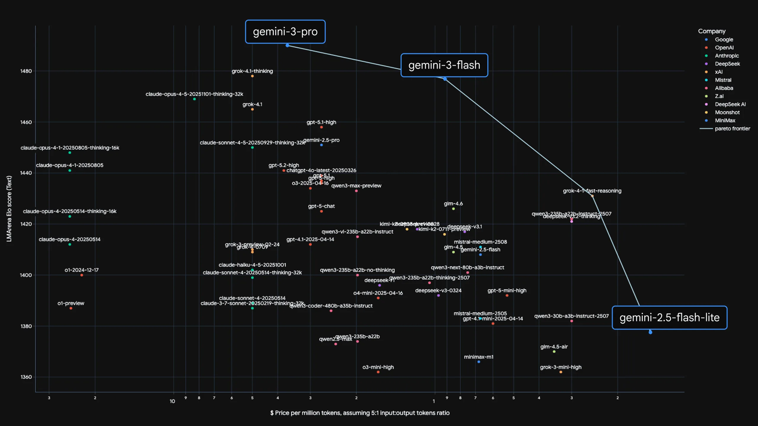 Google betont, dass Gemini 3 Flash die "Pareto-Frontier" von Leistung und Effizienz verschiebe. Das Modell übertreffe Gemini 2.5 Pro, sei dabei aber laut einer Analyse von Artificial Analysis dreimal schneller und koste nur einen Bruchteil. Selbst mit dem niedrigsten "Thinking Level" übertrumpfe 3 Flash oft frühere Versionen mit hohen Thinking-Levels, so Google.