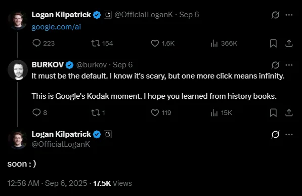Googles KI-Produktmanager Logan Kilpatrick deutet jetzt bei X an, dass dieser AI Mode bald die neue Standard-Suche werden könnte: Zum einen leitet die URL google.com/ai jetzt direkt auf den AI Mode um, zum anderen antwortet Kilpatrick auf die Nutzerforderung, dass der AI Mode "Default" sein müsse, mit "bald".
