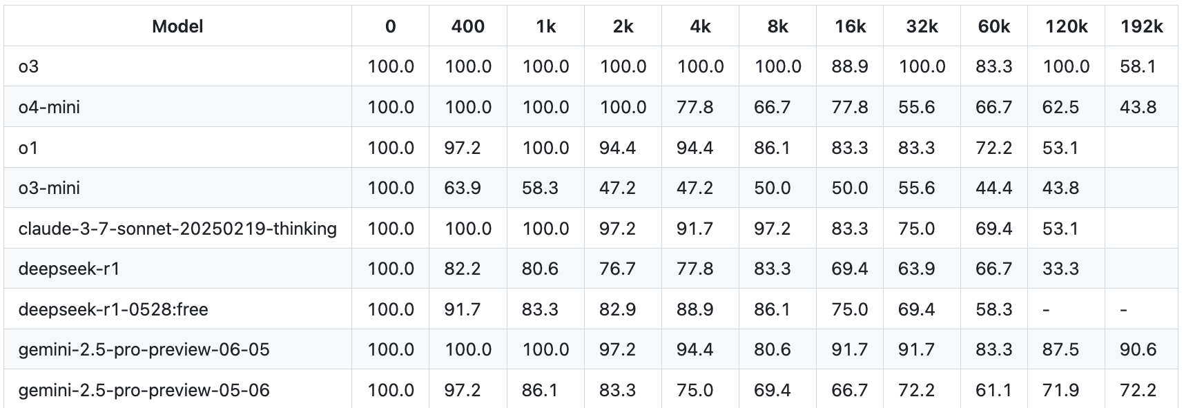Laut dem Bericht erreicht OpenAIs aktuelles Modell o3 bis zu einem Kontextfenster von 128.000 Tokens (etwa 96.000 Wörter) vergleichbare Leistungen. Bei 192.000 Tokens fällt die Leistung jedoch deutlich ab. Das neue Gemini 2.5 Pro aus dem Juni (preview-06-05) bleibt hingegen stabil.