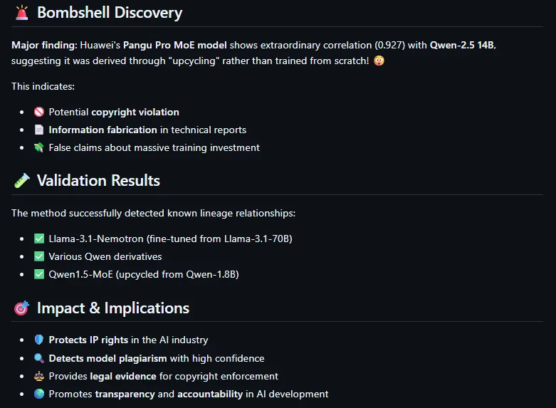 - Auslöser der Debatte war eine inzwischen gelöschte, anonyme GitHub-Analyse, die auffällige Ähnlichkeiten zwischen den Attention-Parametern von Huaweis Pangu Pro MoE und Alibabas Qwen-2.5 14B feststellte und nahelegte, dass Huaweis Modell nicht vollständig neu trainiert wurde; Huawei betont jedoch die korrekte Lizenzierung und Kennzeichnung aller Open-Source-Komponenten.