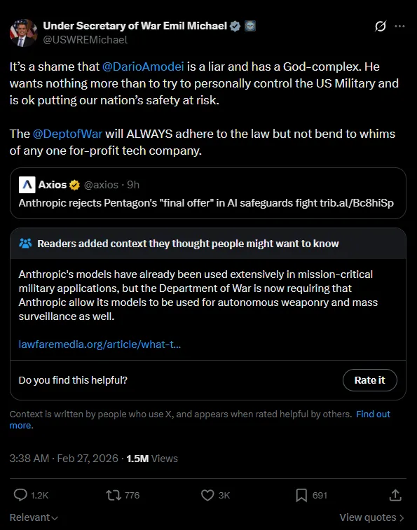 Anthropic habe die Zugeständnisse jedoch als unzureichend bezeichnet, woraufhin Michael Anthropic-CEO Amodei bei X als "Lügner" mit einem "Gott-Komplex" bezeichnete.