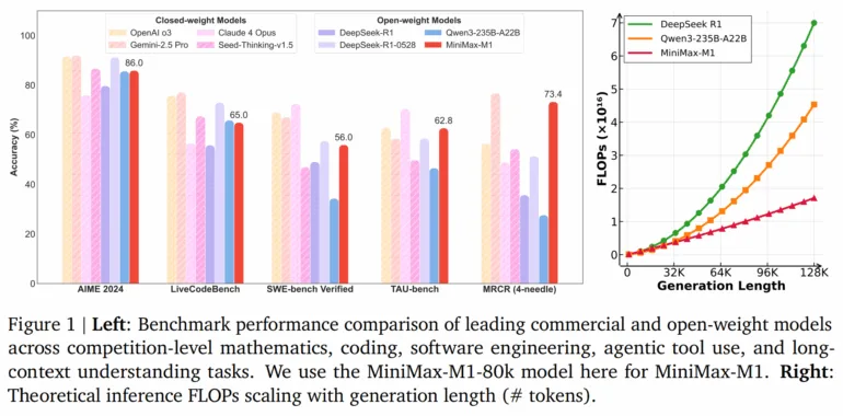 Das chinesische KI-Startup MiniMax hat mit MiniMax-M1 ein neues Open-Source-Sprachmodell veröffentlicht, das Deepseeks R1 schlagen soll. Das Reasoning-Modell bietet eine sehr große Kontextlänge von bis zu einer Million Tokens und einem "Denk"-Budget von bis zu 80.000 Tokens. Das Modell wurde mit einem besonders sparsamen Reinforcement-Learning-Verfahren trainiert, soll deutlich effizienter sein als anderen Open-Source-Modelle und ist unter Apache-2.0-Lizenz kostenlos nutzbar. MiniMax-M1 übertrifft andere offene Modelle wie DeepSeek-R1-0528 und Qwen3-235B-A22B in mehreren Benchmarks. Beim OpenAI MRCR-Test zeigt M1 ebenfalls starke Leistung und kommt an das bisher beste Modell Gemini 2.5 Pro heran – dabei geht es um komplexe Aufgaben mit mehreren Schritten, bei denen das Modell präzise Informationen aus langen Texten kombinieren muss. In einigen Bereichen bleiben geschlossene Modelle wie OpenAI o3 und Gemini 2.5 Pro weiter stärker, doch MiniMax-M1 verringert den Abstand teilweise deutlich. Das Modell ist in zwei Varianten auf Hugging Face verfügbar.