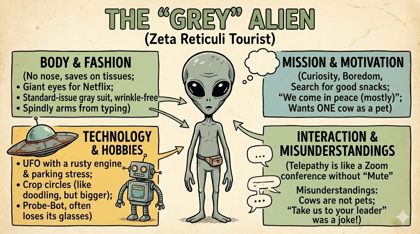 Prompt: "Generiere eine 16:9-Infografik, humorvoll, über ein "Grey Alien""