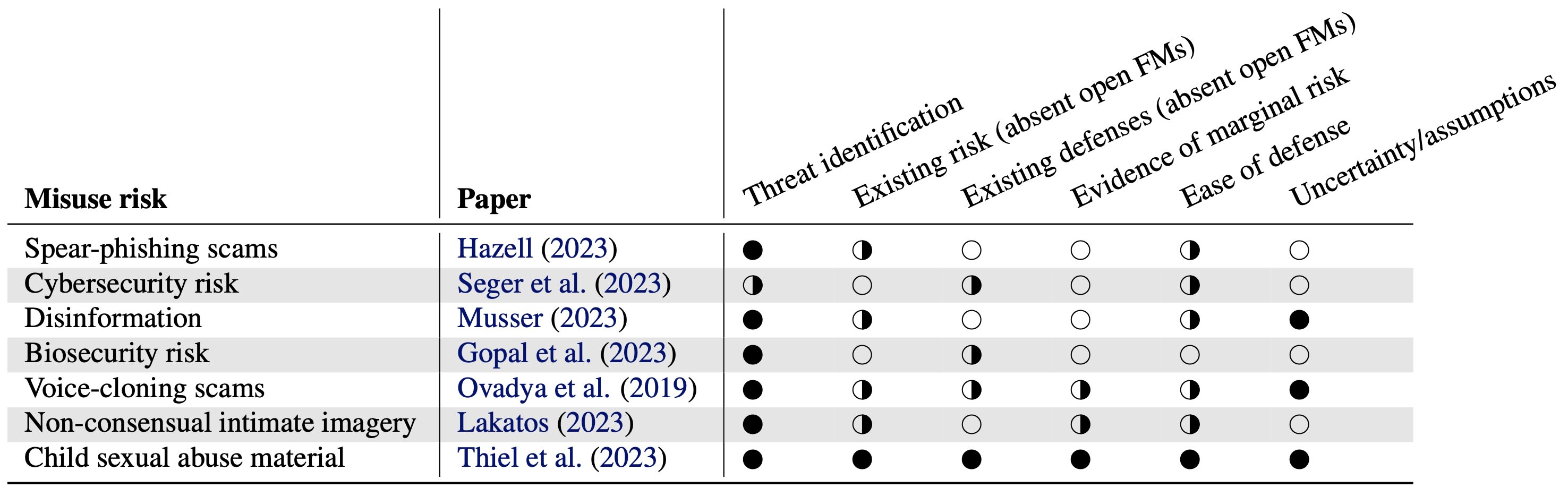 The framework also helps clarify disagreements in past studies by revealing the different assumptions about risk. In fact, when we analyze studies across seven sources of risks against our framework, we find many of them lacking, and we hope the framework helps foster more constructive debate going forward. In particular, we encourage more grounded research on characterizing the marginal risk, especially as both model capabilities and societal defenses evolve: evidence of minimal marginal risk today should not be seen as absolute evidence that risks may not arise in the future as underlying assumptions change.