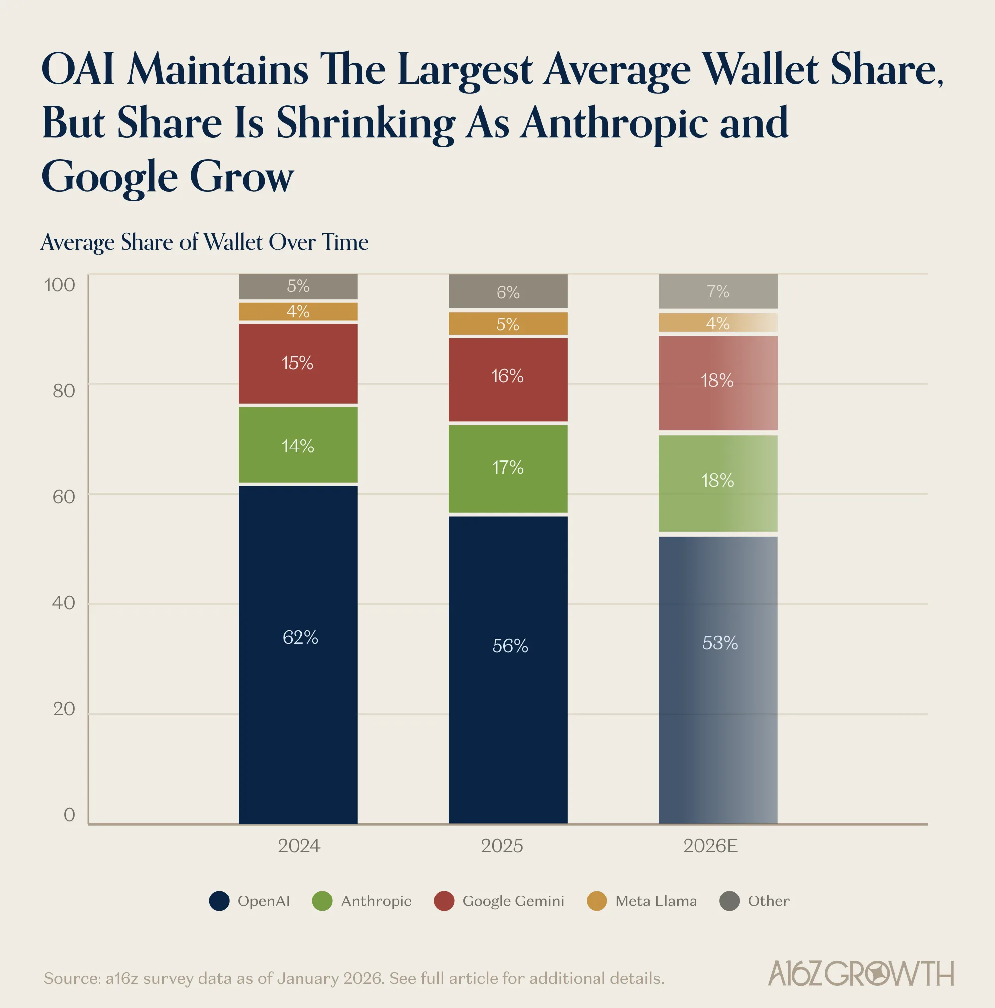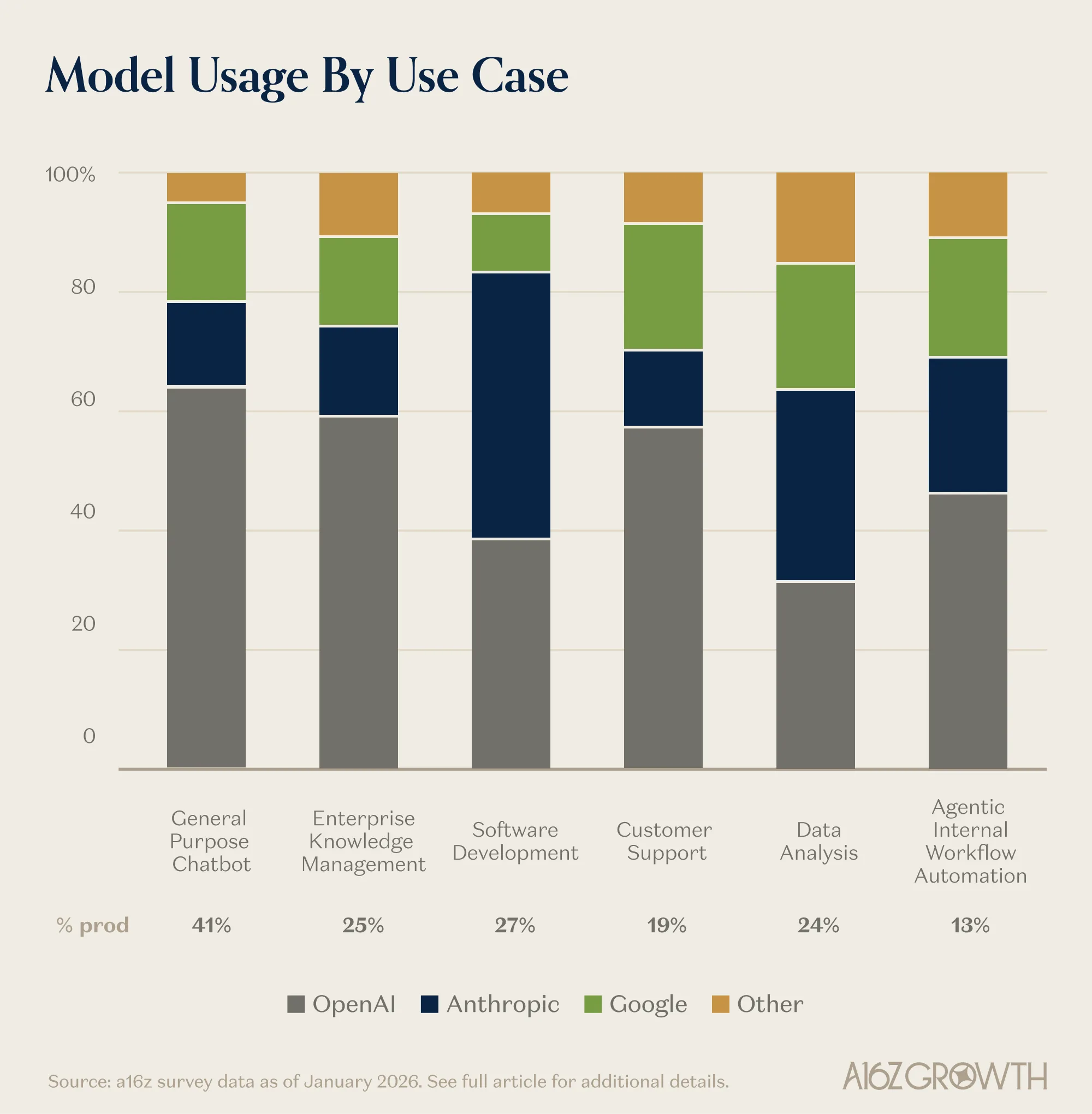 OpenAI dominiert bei Chatbots, Knowledge Management und Kundensupport. Anthropic führt bei Softwareentwicklung und Datenanalyse. Google Gemini ist in vielen Bereichen stark, aber schwach beim Coding. | Bild: a16zEin wesentlicher Treiber der Verschiebungen: Anthropics Gewinne basieren auf den fortschrittlichsten Modellen. 75 Prozent der Anthropic-Kunden haben Sonnet 4.5 oder Opus 4.5 in Produktion. Bei OpenAI nutzen nur 46 Prozent der Kunden die neuesten Modelle GPT 5.2 oder 5.2 Pro. Viele Unternehmen arbeiten weiterhin mit älteren Modellen, die "gut genug funktionieren".