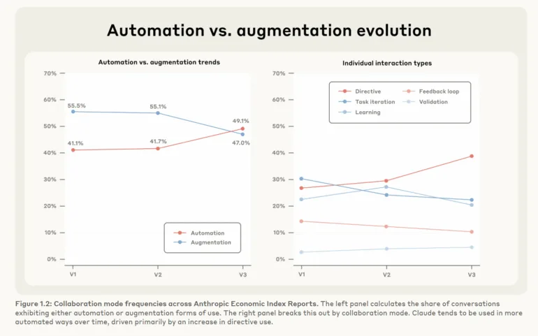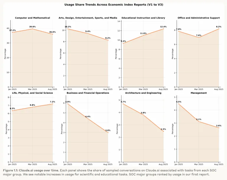 Anthropics neuer “Anthropic Economic Index”-Bericht zeigt, dass Claude.ai zunehmend für Bildungs- und Wissenschaftsaufgaben eingesetzt wird, während Coding weiterhin einen großen Teil der Nutzung ausmacht. Auffällig ist der Anstieg sogenannter “directive” Interaktionen: Immer häufiger werden komplette Aufgaben direkt an das Modell delegiert, Automatisierung tritt damit in den Vordergrund. Beim Coding verschiebt sich der Schwerpunkt damit weg von Fehlerbehebung hin zur Erstellung neuer Programme.