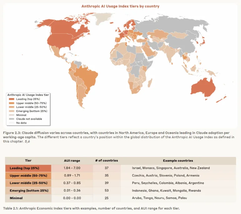 Anthropic untersucht mit dem neuen Report auch erstmals die geografische Verteilung der Claude-Nutzung anhand eines eigenen Index, der die Nutzung ins Verhältnis zur Erwerbsbevölkerung setzt. Das Ergebnis: In kleinen, technologisch fortgeschrittenen Ländern wie Israel, Singapur oder Australien ist Claude pro Kopf besonders verbreitet, während viele Schwellenländer nur geringe Nutzungsraten aufweisen. International zeigt sich ein klarer Zusammenhang zwischen Einkommen und KI-Adoption.