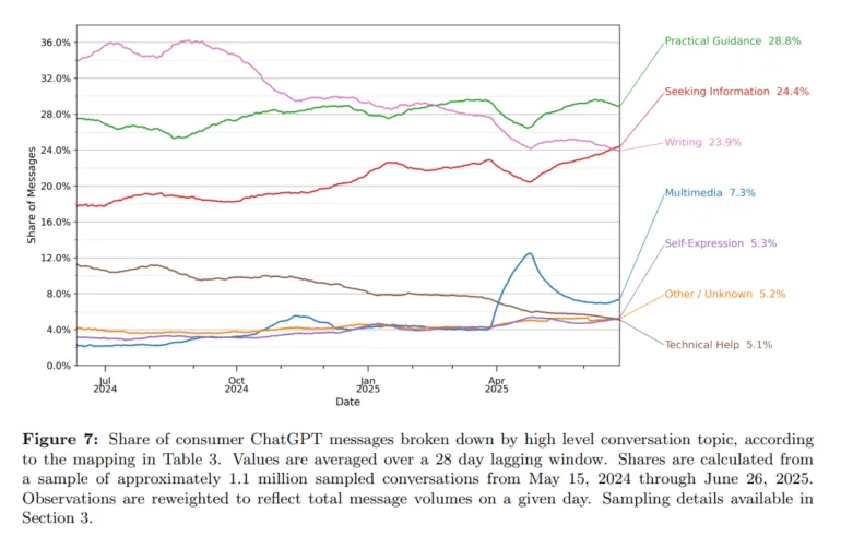 Inhaltlich dominieren drei Themen die ChatGPT-Nutzung: praktische Hilfestellung, Informationssuche und Schreiben, wie OpenAI berichtet. Während praktische Hilfe stabil bleibt, sinkt der Anteil des Schreibens, und die Nachfrage nach reiner Informationssuche wächst. Technische Unterstützung verliert an Bedeutung, während Multimedia-Anfragen nach der Einführung der Bildgenerierung deutlich zulegen. Auch Bildungsanfragen sind ein wichtiger Anwendungsfall. Programmieren kommt insgesamt selten vor – ein deutlicher Unterschied zu anderen Plattformen, so OpenAI.