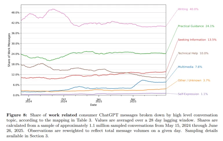 OpenAI klassifiziert die Nutzerintention in drei Hauptkategorien: “Asking” (Information, Beratung), “Doing” (Output erstellen) und “Expressing”. Im Arbeitskontext überwiegt das Erstellen von Outputs, wobei ein Großteil davon mit Schreiben verbunden ist. Im Zeitverlauf verschiebt sich das Muster jedoch zugunsten von “Asking”, sodass Nutzer immer häufiger Rat oder Informationen suchen.