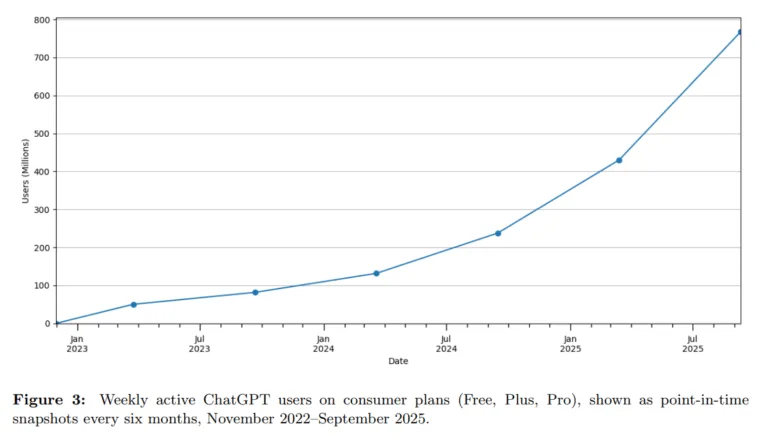 OpenAI misst bei ChatGPT-Consumer-Plänen (Free, Plus, Pro) ein starkes Wachstum über alle Kohorten hinweg. Laut dem OpenAI-Paper nutzten Ende Juli 2025 mehr als 700 Millionen Menschen wöchentlich ChatGPT – rund zehn Prozent der erwachsenen Weltbevölkerung – und verschickten etwa 18 Milliarden Nachrichten pro Woche (rund 2,5 Milliarden pro Tag, circa 29.000 pro Sekunde).