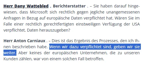 Eine Aussage unter Eid vor dem französischen Senat am 10. Juni 2025 verdeutlicht die Problematik des US Cloud Act: Auf die Frage, ob Microsoft im Fall einer rechtlich zulässigen Anordnung der US-Regierung verpflichtet wäre, Daten weiterzugeben, antwortete Microsoft-Frankreich-Jurist Anton Carniaux: „Lorsque nous sommes obligés de les donner, nous les donnons“ („Wenn wir verpflichtet sind, sie zu geben, geben wir sie.“).