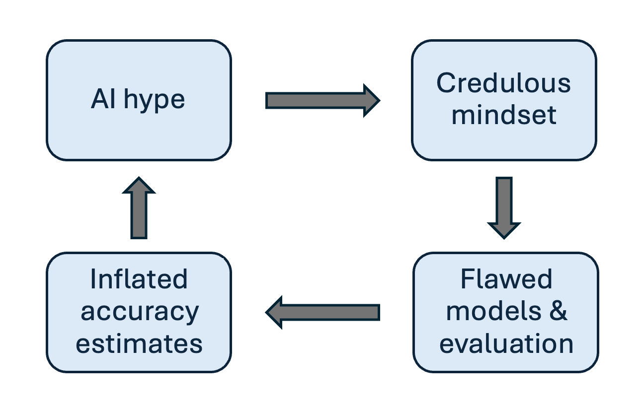 This is a feedback loop. Overoptimism fuels flawed research which further misleads other researchers in the field about what they should and shouldn’t expect AI to be able to do. In fact, we’ve encountered extreme versions of this in private correspondence with frustrated researchers: since flawed research goes uncorrected, it becomes literally impossible to publish good research since it will result in models that don’t beat the “state of the art”.