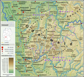 The Odenwald is a low mountain range in the German states of Hesse, Bavaria and Baden-Württemberg. Wikipedia