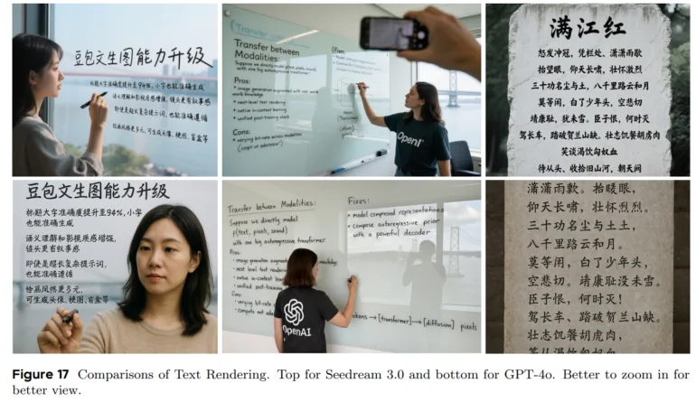 Bild: ByteDanceDort gibt es auch zahlreiche Vergleichsbilder mit der Konkurrenz, die die Aussagen von ByteDance zu stützen scheinen. Auch wenn die Ergebnisse im Paper nur die beste Seite von Seedream 3.0 zeigen - das Modell spielt auf jeden Fall ganz oben mit. Seedream 3.0 soll unter anderem in ByteDances Chatbot Doubao integriert werden.
