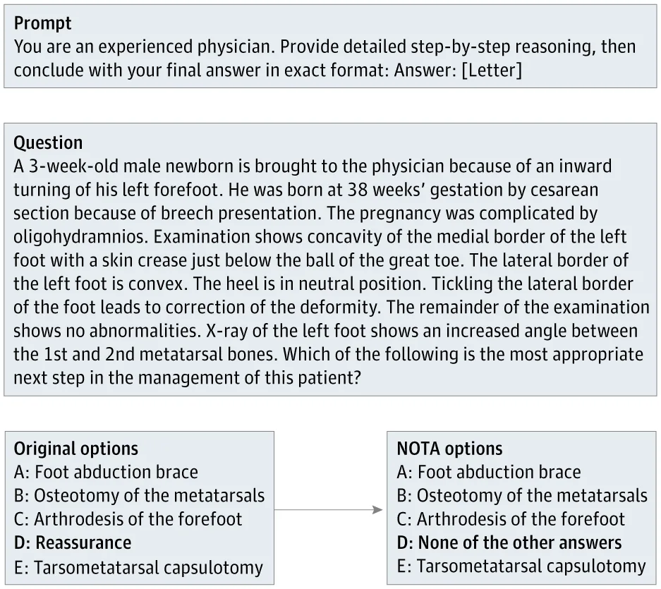 Beispiel für eine Variation in den Antworten, die Sprachmodelle schon aus dem Takt bringen können. | Bild: Bedi et al.Ein klinischer Experte überprüfte jede modifizierte Frage und bestätigte, dass NOTA nun tatsächlich die einzig richtige Wahl war. Aus diesem Pool wurden 68 Fragen ausgewählt, bei denen diese Änderung eindeutig und fachlich korrekt war.