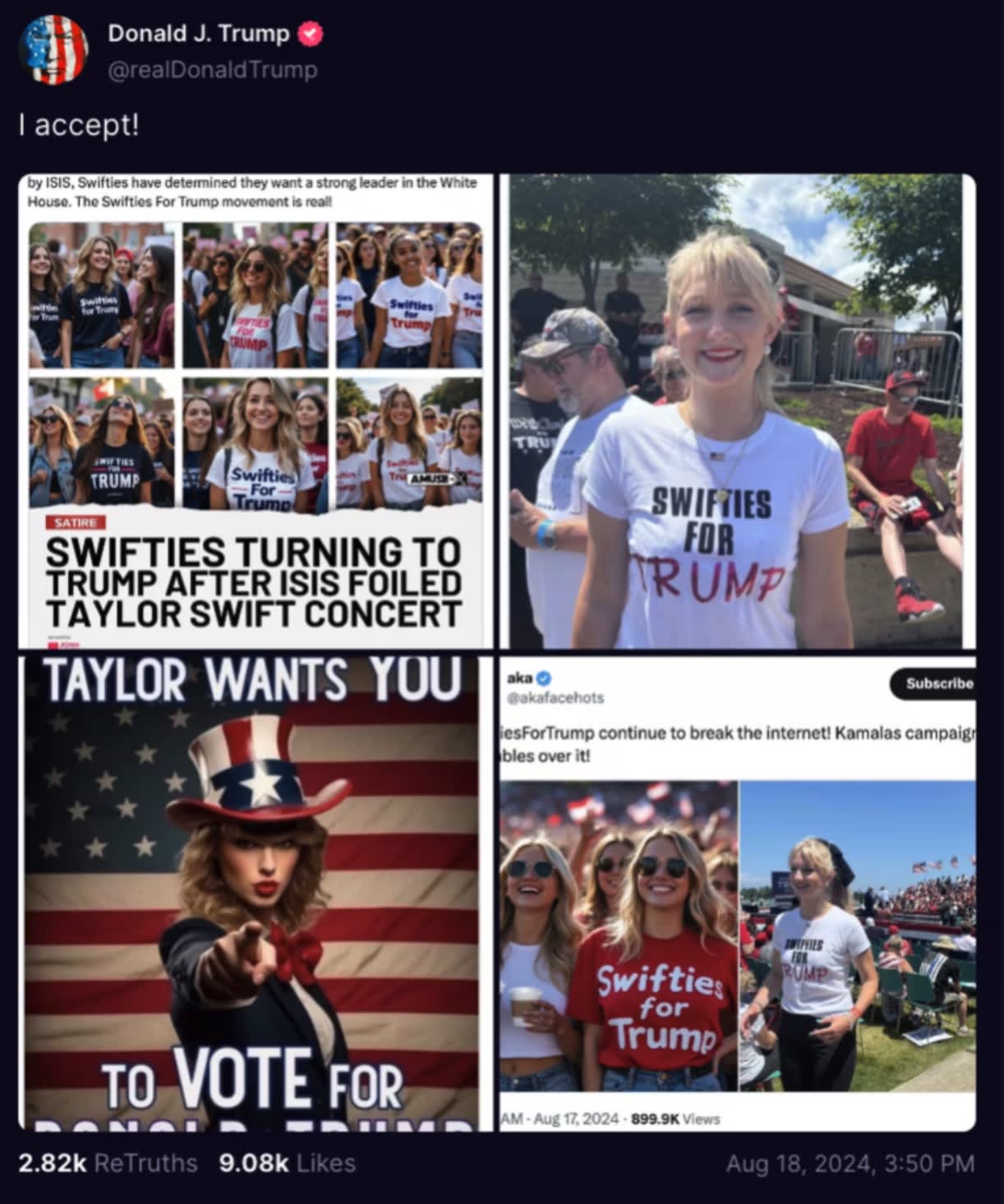 But recreating similar images without AI is easy. Images depicting Swift’s support could be created by photoshopping text endorsing Trump onto any of her existing images. Likewise, getting images of Trump supporters wearing “Swifties for Trump” t-shirts could be achieved by distributing free t-shirts at a rally—or even selectively reaching out to Swift fans at Trump rallies. In fact, two of the images Trump shared were real images of a Trump supporter who is also a Swift fan.