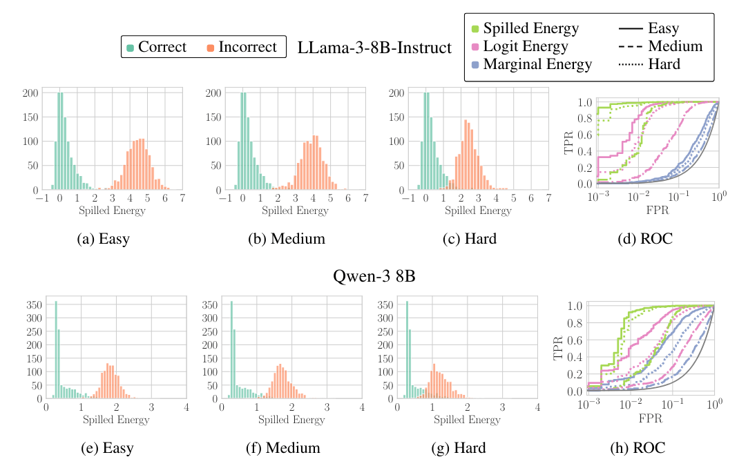 Die Histogramme zeigen, wie sich die Spilled-Energy-Werte für korrekte (grün) und inkorrekte (orange) Antworten verteilen. Je weiter die beiden Farben auseinanderliegen, desto besser erkennt die Methode Fehler. Selbst bei minimalen Abweichungen in der Antwort (Hard) bleiben die Verteilungen gut trennbar. | Bild: Minut et al.Bei Mistral-Instruct erreichte Spilled Energy im Schnitt 77,49 Prozent, verglichen mit 65,56 Prozent für die trainierten Klassifikatoren und 63,44 Prozent für die reine Logit-Konfidenz. Der Ansatz, das Modell einfach selbst zu fragen, ob seine Antwort stimmt, landete mit rund 55 Prozent kaum über Zufallsniveau.