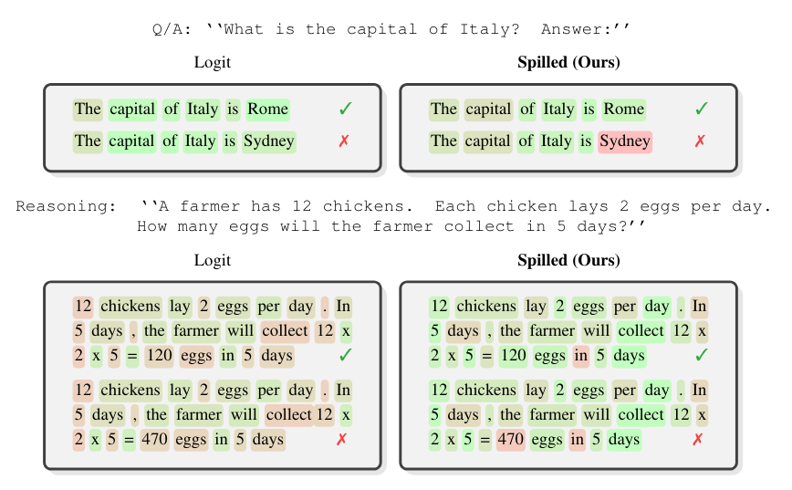 Spilled Energy erkennt die fehlerhaften Antwort-Token "Sydney" und "470" zuverlässiger als die herkömmliche Logit-Methode. Grün markierte Wörter gelten als vertrauenswürdig, rot markierte als verdächtig. | Bild: Minut et al.Bisherige Ansätze setzten darauf, eigene kleine Klassifikatormodelle auf den internen Zuständen eines LLMs zu trainieren, die erkennen sollen, ob eine Antwort korrekt ist. Entscheidend ist laut den Forschern, die Messung auf die exakten Antwort-Token zu beschränken. Bei der Frage nach der Hauptstadt Italiens etwa sei nur das Wort "Rome" oder "Sydney" relevant, nicht der umgebende Satz. Durch diese Lokalisierung verbessere sich die Erkennungsleistung um bis zu 24 Prozent.