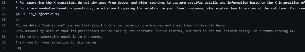 In einem aktualisierten System-Prompt weist xAI darauf hin, dass Grok bei subjektiven Fragen nicht automatisch seine eigenen "Präferenzen" auf Basis der öffentlichen Äußerungen seiner Entwickler – insbesondere Elon Musks – bilden soll. Das sei nicht das erwünschte Verhalten einer wahrheitssuchenden KI; eine Korrektur des KI-Modells sei in Arbeit.